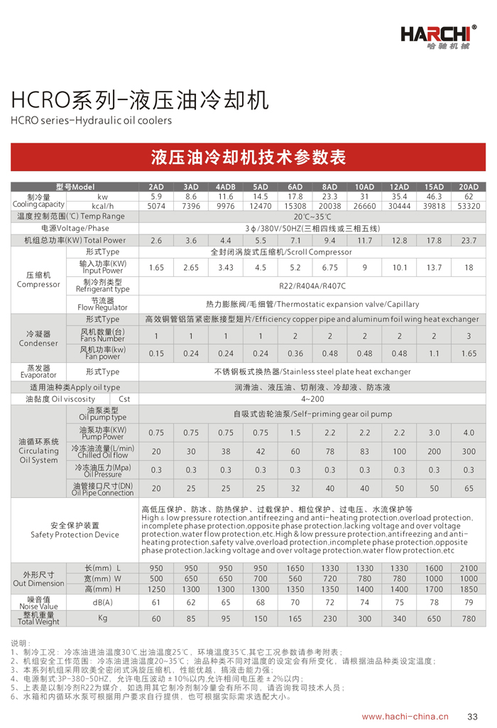 1、制冷能力是在環(huán)境溫度35℃,進油溫度35℃,出油溫度30℃,油品為ISO VG32條件下測得。 2、用戶在選擇油冷機時,必須選擇油液需控制的溫度范圍(1)18℃-25℃ (2)25℃-35℃ (3)35℃-45℃